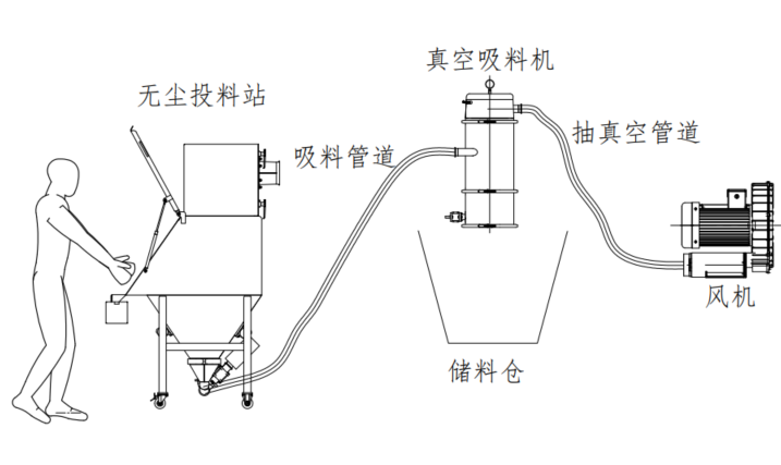 無塵投料站的工作原理是投料時產(chǎn)生的物料粉塵被離心風機或抽氣管道形成的負壓吸到過濾系統(tǒng)中,使物料與空氣分離,防止粉塵四散逃逸、污染周圍環(huán)境和保護操作者身體健康。